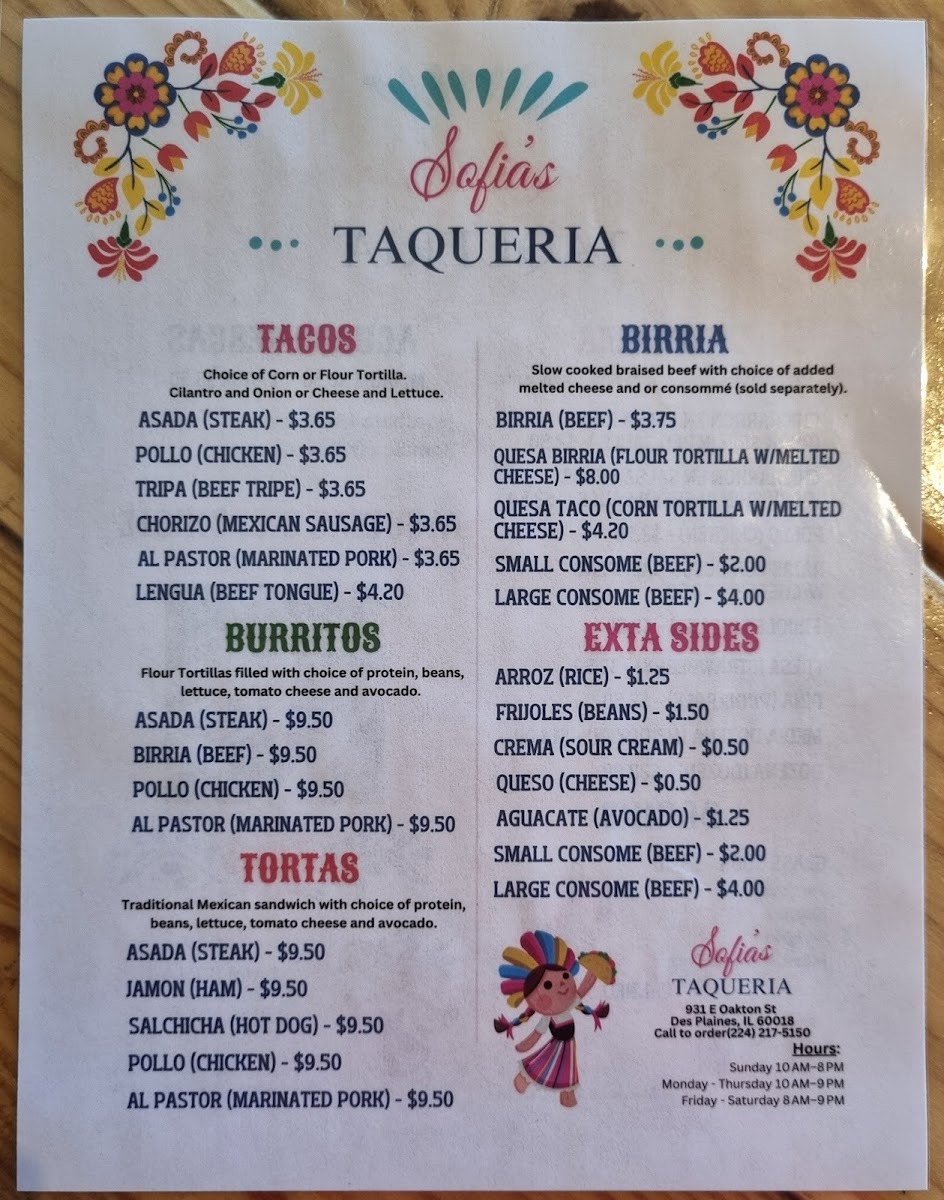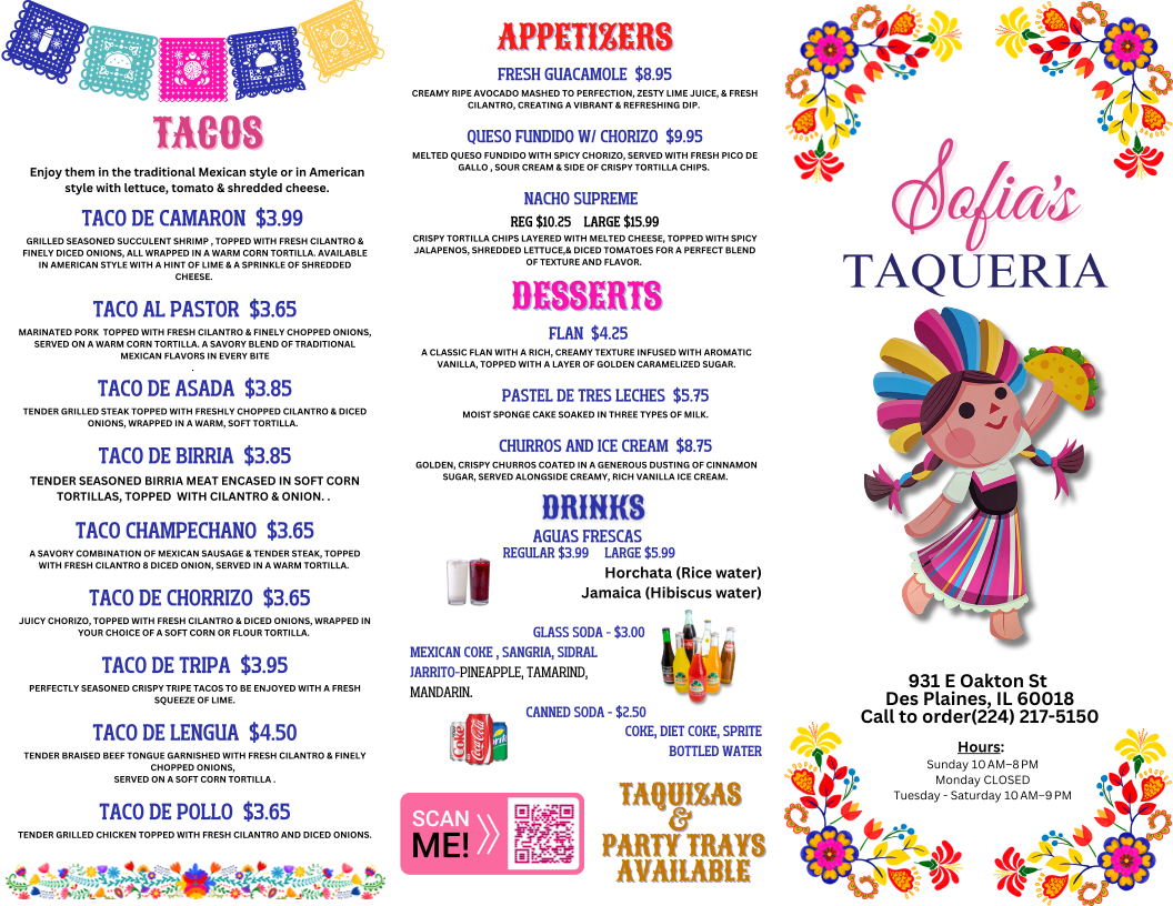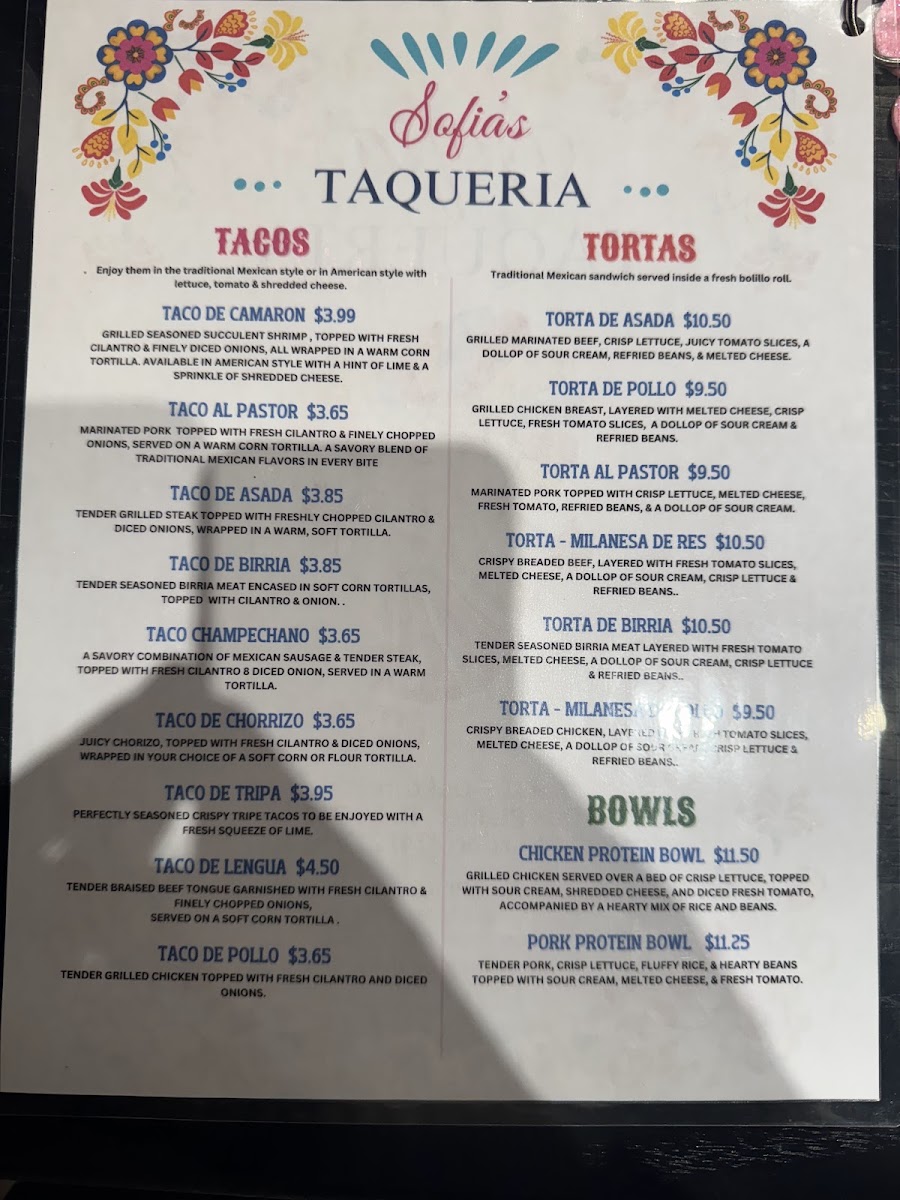 Sofia's Taqueria Menu offers a vibrant selection of authentic Mexican flavors that’ll transport your taste buds straight to the heart of Mexico. Whether you're in the mood for a quick bite or a full meal, the menu has something for everyone. From the classic tacos, bursting with fresh ingredients and savory fillings, to the zesty salsas and hearty burritos, Sofia’s Taqueria doesn’t hold back on taste. The variety of options ensures that every craving is met, whether you’re a fan of tender carne asada, flavorful al pastor, or something more adventurous.